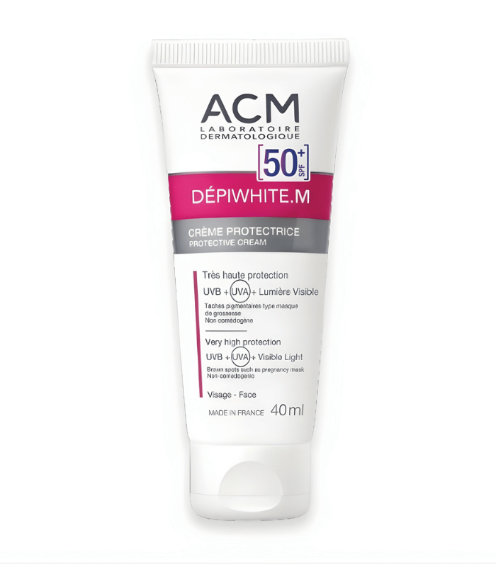 Dépiwhite M Crème Protectrice SPF50+ est une crème solaire visage développée par ACM pour protéger la peau exposée au soleil, en particulier les peaux concernées par les taches pigmentaires.