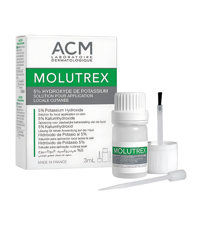 ACM Molutrex est une solution cutanée à base d’hydroxyde de potassium 5%. Elle s’utilise localement sur la peau.