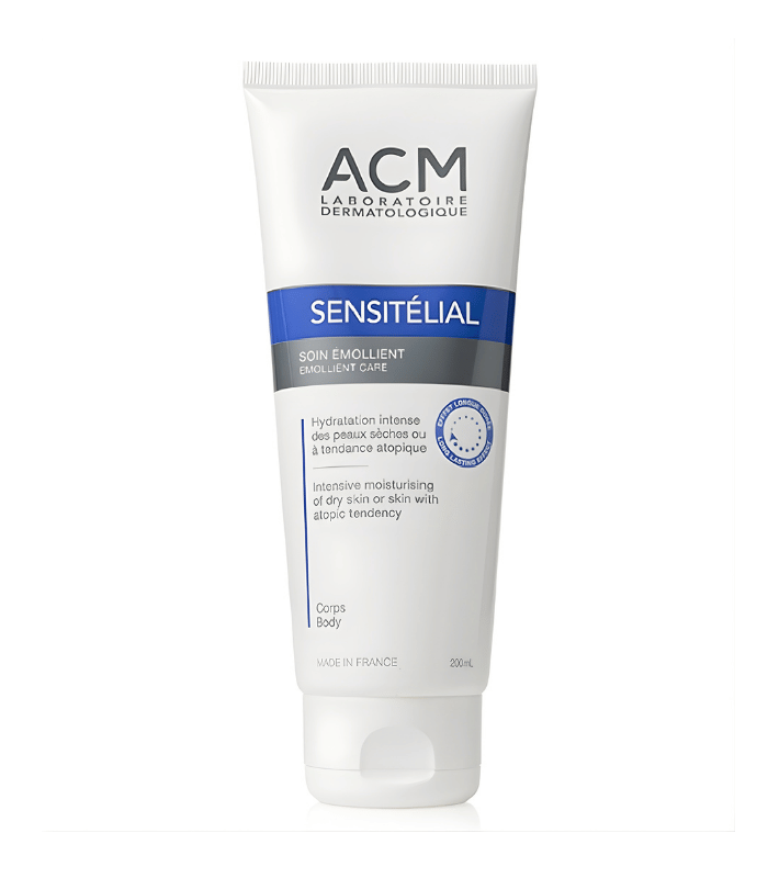 ACM Sensitélial Soin Émollient est un soin corporel dermatologique destiné aux peaux sèches, très sèches ou à tendance atopique. Il s’utilise au quotidien pour soutenir l’hydratation de la peau.