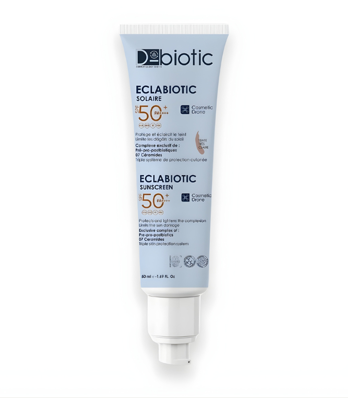 Eclabiotic Solaire Teinté Très Claire SPF 50+ D-Biotic est une crème solaire visage à très haute protection. Elle protège la peau contre les rayons UVA et UVB, responsables des taches brunes. Sa teinte très claire aide à unifier le teint dès l’application. La texture est légère et confortable, sans effet masque. Ce soin est idéal pour une utilisation quotidienne. Il aide à protéger la peau du soleil tout en améliorant l’aspect du teint.