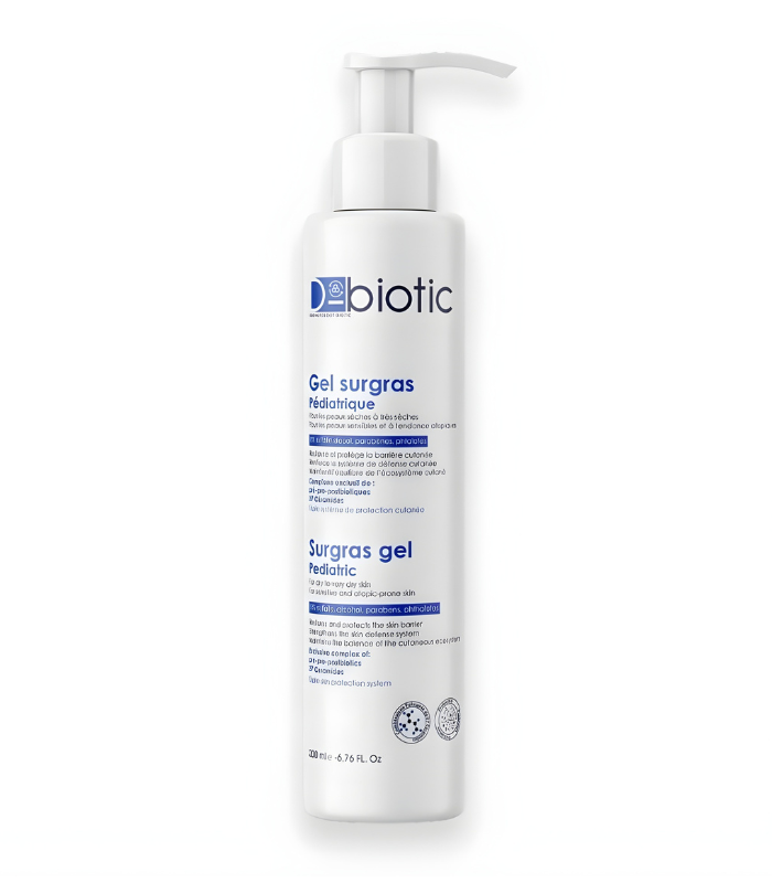 Le gel nettoyant surgras pédiatrique D-Biotic nettoie la peau fragile des bébés et des enfants. Il est adapté aux peaux sèches, très sèches et sensibles. Sa formule douce aide à respecter la barrière naturelle de la peau. Il nettoie sans dessécher et apporte du confort au quotidien. Ce gel est sans sulfates et sans alcool. Il convient pour le visage et le corps. La peau reste propre, souple et douce après chaque lavage. Usage quotidien dès le plus jeune âge.